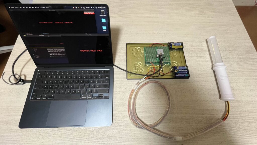市販のペンライトの操作感を維持しつつ、センシングとフィードバック機能を備えたデバイスを独自に設計しました。内部には3軸加速度センサと振動モータを搭載し、ユーザーの微細な振りの動きを検知すると同時に、手元へ触覚情報を提示します。また、長時間の使用でも負担にならないよう、制御部を分離することで軽量化を図るなどの工夫を凝らしました。