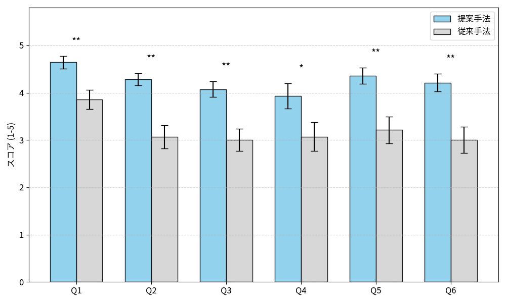 アンケートによる5段階尺度評価の結果、「楽しさ」「参加実感」「一体感」のすべての指標において、提案手法は従来手法を統計的に有意に上回るスコアを記録しました。