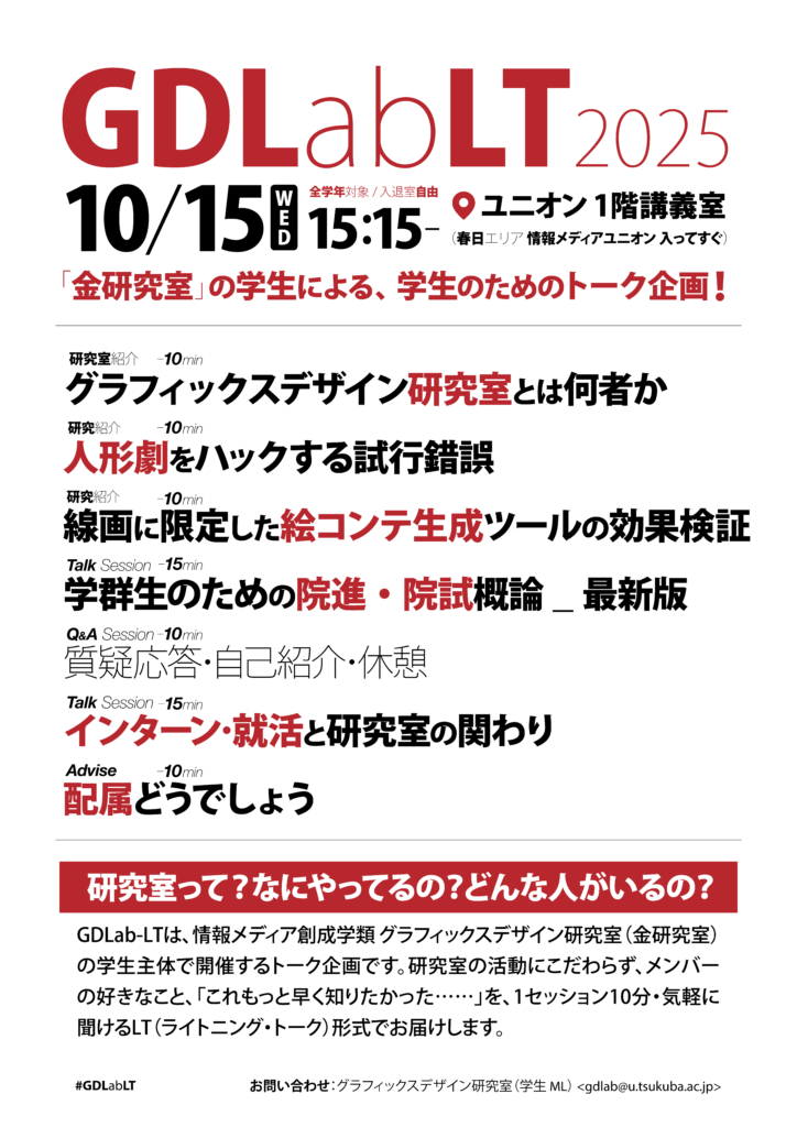 GDLabLT は、情報メディア創成学類 グラフィックスデザイン研究室(金研究室)の学生主体で開催するトーク企画です。研究室の活動にこだわらず、メンバーの好きなこと、「これもっと早く知りたかった……」を、1セッション10分・気軽に聞ける LT(ライトニング・トーク)形式でお届けする予定です。
