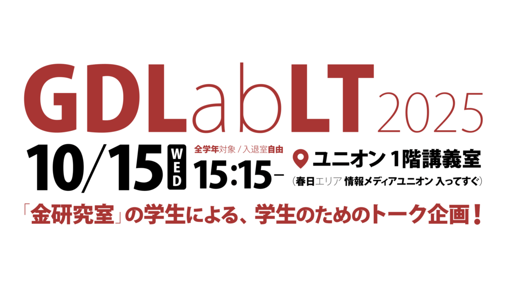 GDLabLT は、情報メディア創成学類 グラフィックスデザイン研究室(金研究室)の学生主体で開催するトーク企画です。研究室の活動にこだわらず、メンバーの好きなこと、「これもっと早く知りたかった……」を、1セッション10分・気軽に聞ける LT(ライトニング・トーク)形式でお届けする予定です。